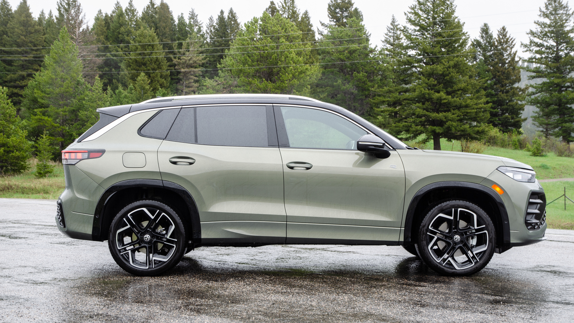 Above left is a 2024 ID.4; above right is the updated prototype we saw earlier this week. The bottom image is of the 2025 Tiguan we drove last year. We can see some Tiguan-esque manipulation in the side profile. The new mirrors appear to be lifted directly from the gas car, for instance, and the prototype also has the same, old-school pull handles found on the Tiguan (versus the flush-fitting flap style on the ID.4). Note that the charge port on the ID.4 has not moved; the image of the production 2024 car has simply been mirrored.